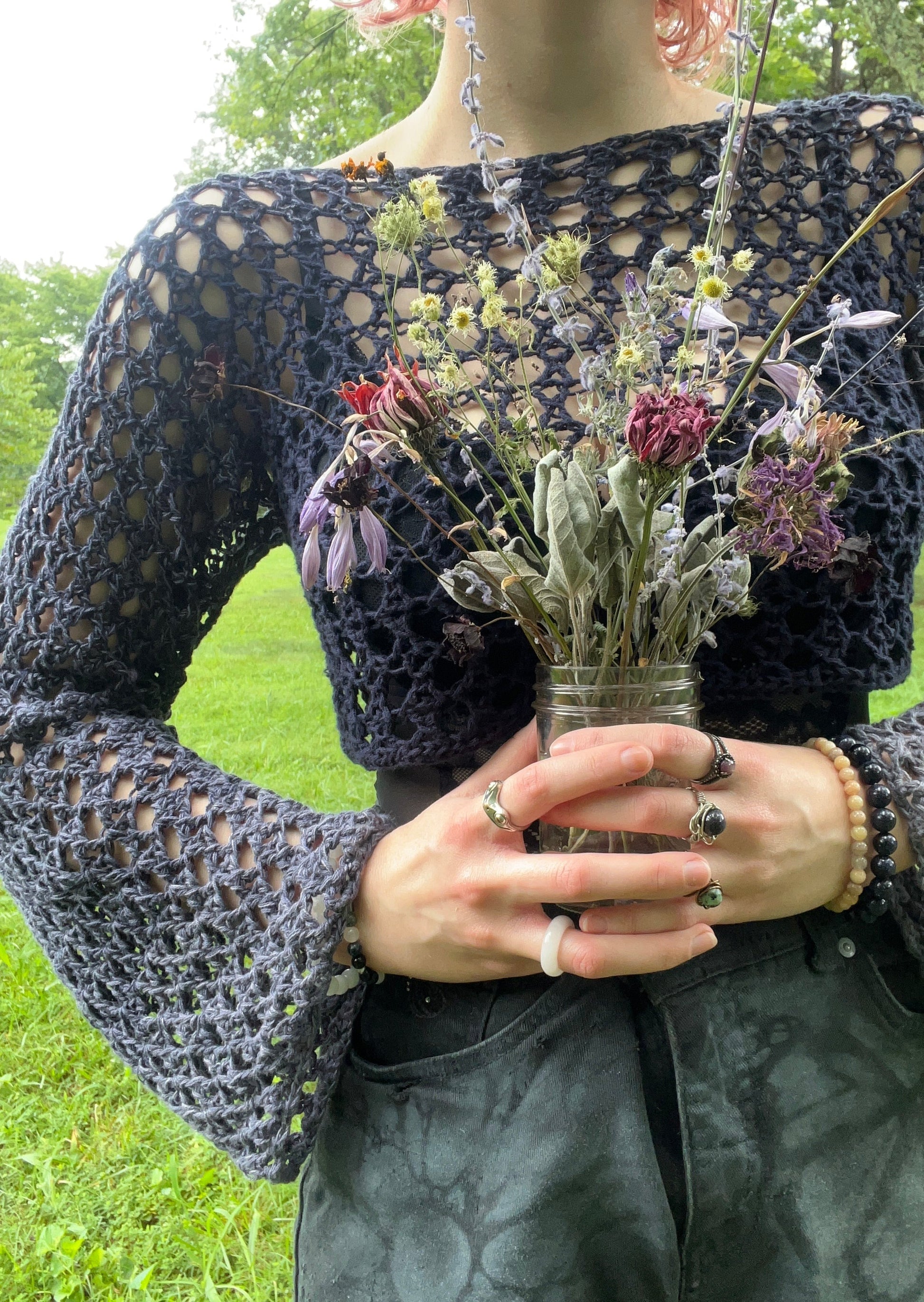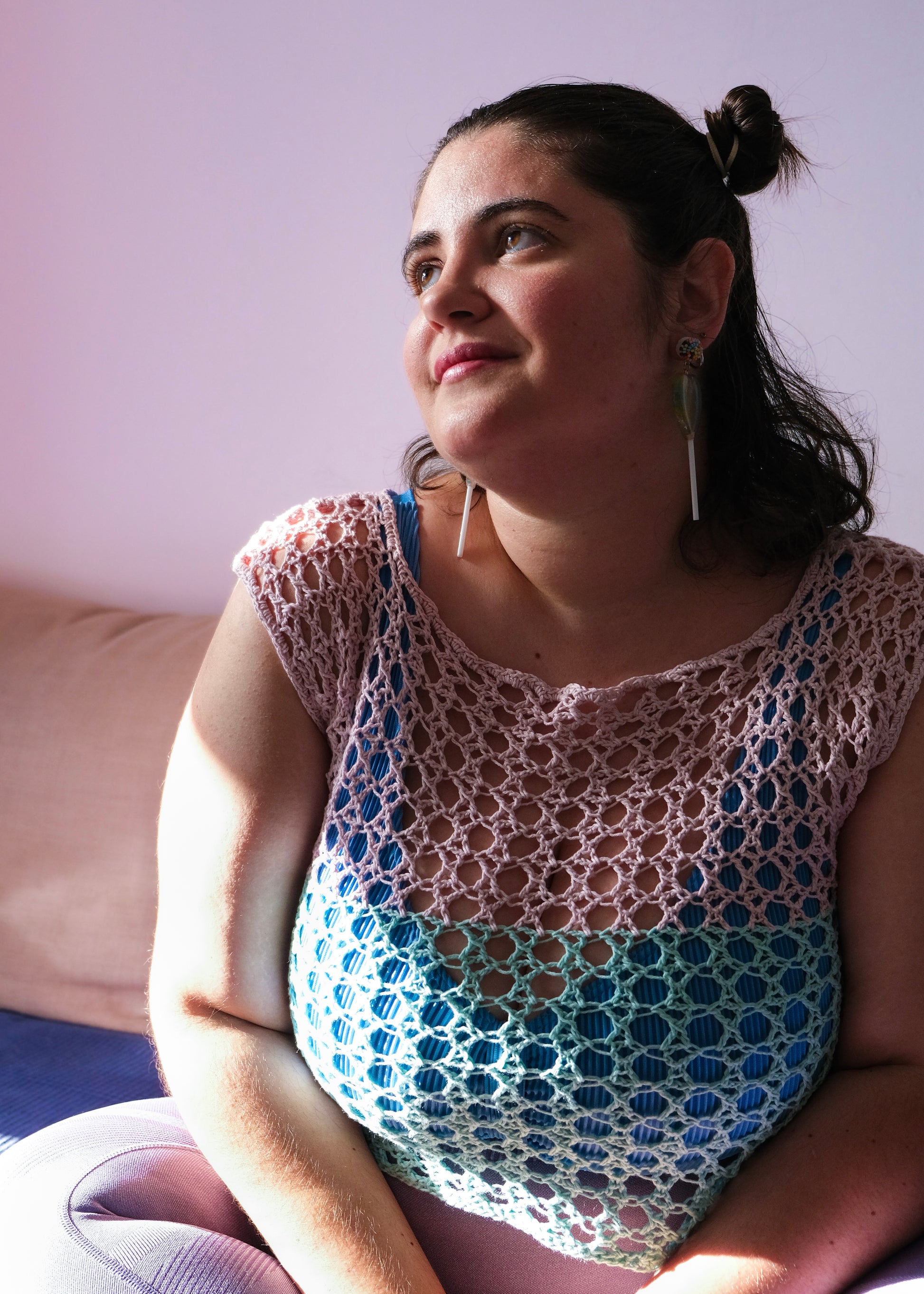 - I used approx 100g of weight 2 acrylic yarn for a long sleeve and 50g of weight 2 cotton yarn for the sleeveless version;